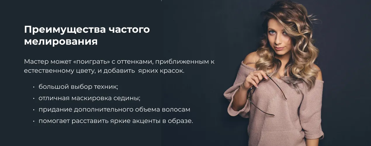 Вторая технология частичного окрашивания, не теряющая популярности уже более десяти лет, – это частое мелирование. Подразумевает осветление 40-60% верхних прядей. Такое мелирование идеально подходит обладательницам тонких волос, визуально добавляет прическе объем.