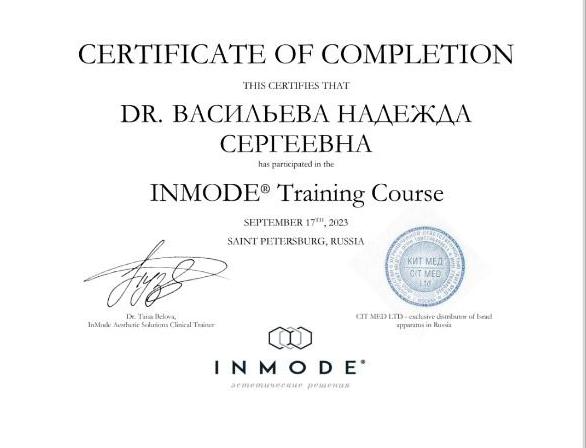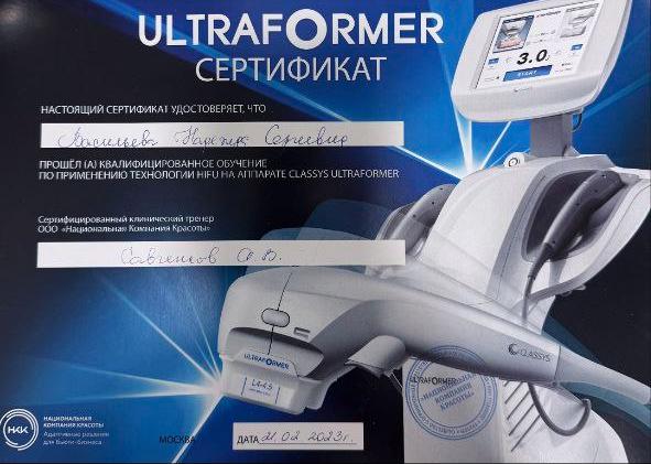 Сертификаты: Аппаратная косметология Nd:YAG в дерматокосметологии, SMAS лифтинг, Микроигольчатый РФ лифтинг, Анатомия в инъекционной практике, Клинико анатомические аспекты сочетанного применения ботулинотерапии и контурной инъекционной пластики лица, Принципы эффективной и безопасной работы, Применение препарата Aqualyx, Микротоковая терапия