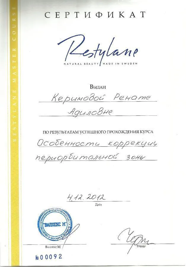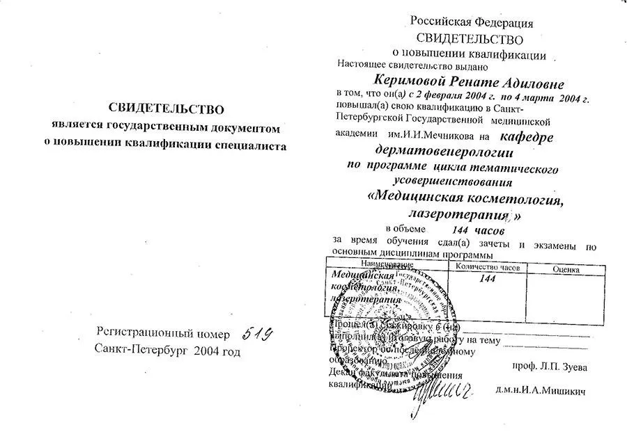 Рената Адиловна окончила Мед.университет им.Акад.И.П.Павлова. Опыт работы 15 лет. Специальность дерматолог -косметолог.