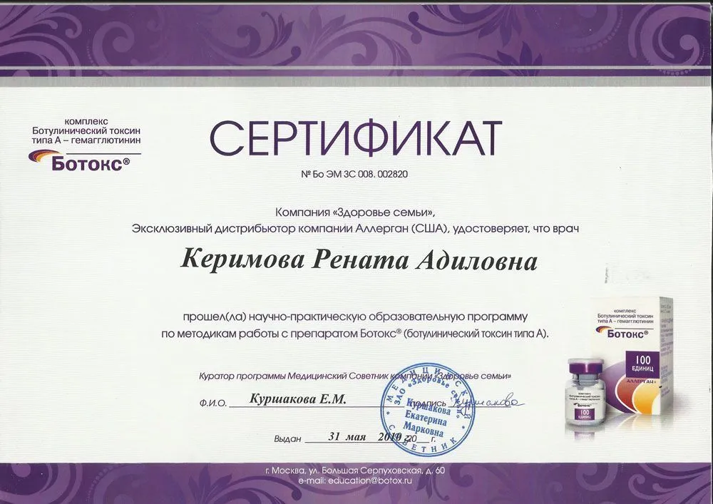 Повышение квалификации «Инъекционная контурная пластика», «Ботокс. Инъекционная коррекция морщин ботулотоксином типа А »
