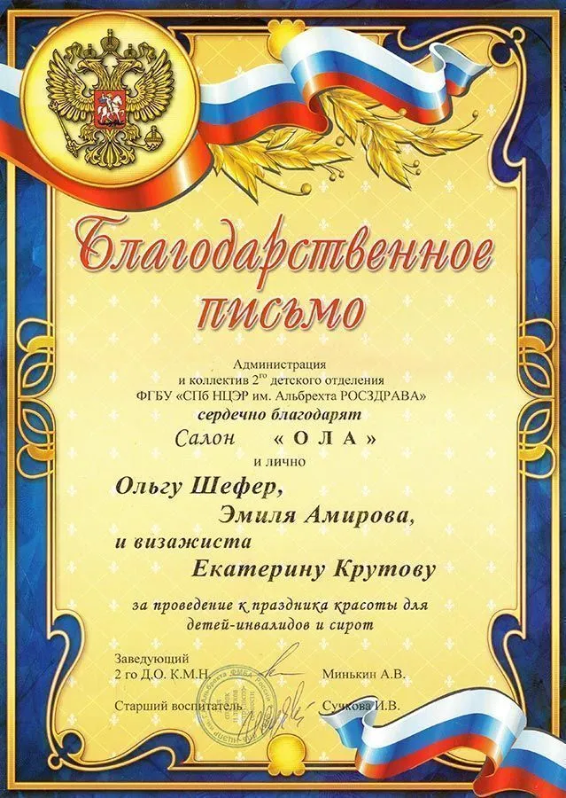 Благодарственное письмо от 2-го детского отделения ФГБУ "СПб НЦЭР им. Альбрехта РОСЗДРАВА"