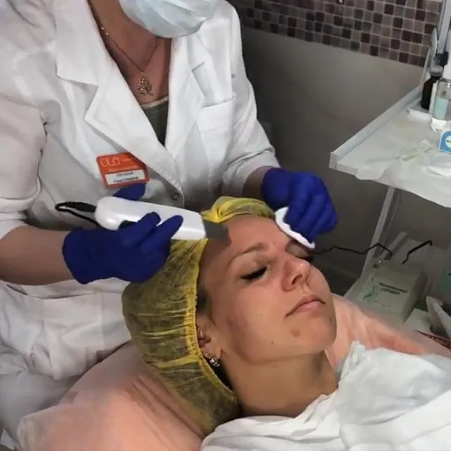 - Процесс чистки – специалист плавно водит по поверхности небольшой лопаточкой, излучающей ультразвук. По одной зоне проходят до 4 раз. Не затрагиваются губы, область возле глаз, зона щитовидной железы