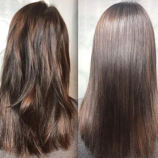 Волосы выглядят идеально ровными и блестящими на протяжении 3-6 месяцев. Но кератину свойственно накапливаться в волосах. После проведения 2-3 процедур результат может радовать до 8 месяцев.