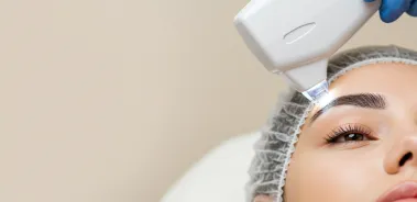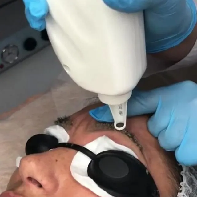- Выведение перманентного макияжа. Прикрывая салфеткой глаз, другой рукой специалист воздействует лазером на татуаж. Аппарат держат на расстоянии 5-10 см от глаз.