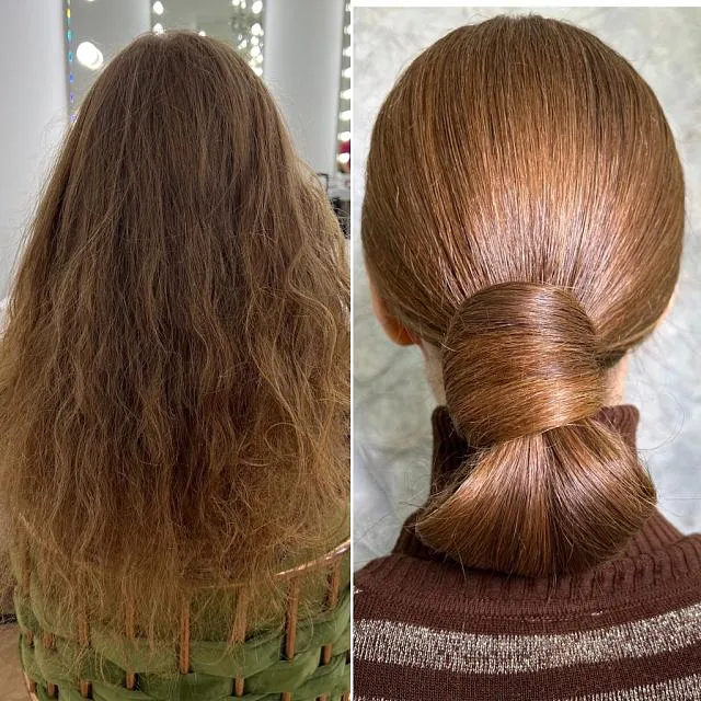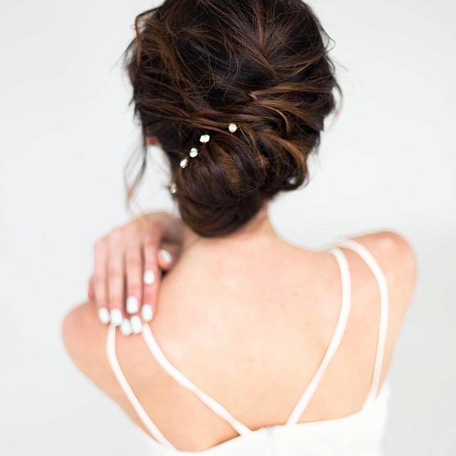 - Обладательницам длинных волос аналогичной комплекции следует отдать предпочтение распущенным локонам либо элегантным пучкам, украшенным дорогими аксессуарами или цветами.